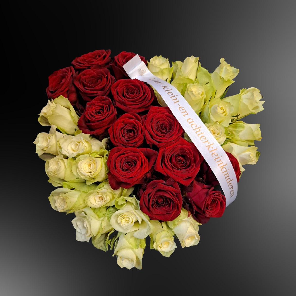 Een indrukwekkend bloemenhart in tinten van rood en wit.