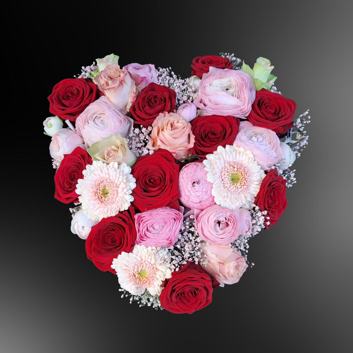 Een hartstochtelijk bloemenhart in tinten van rood en roze.