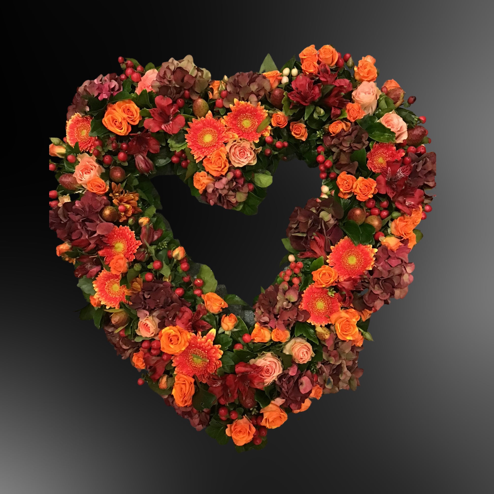 Een diepgevoeld rouwhart in tinten van rood en bordeaux, samengesteld om troost en respect te bieden tijdens de moeilijkste momenten. Breng een eerbetoon met onze rouwbloemen, liefdevol samengesteld voor het laatste afscheid.